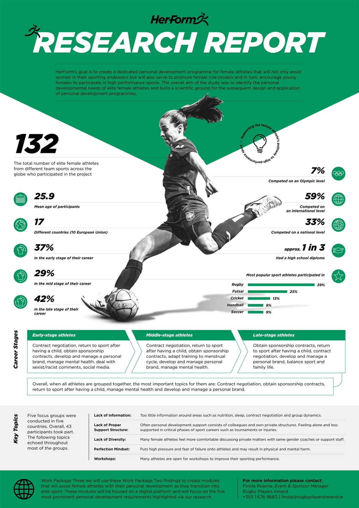 Our findings suggest the need to implement specific career support programs tailored to the career stages of female athletes. Consequently, these novel results will build the scientific ground for the subsequent design of the digital HerForm training hub. These platform resources will also be linked with on-site workshops, delivered by service providers in female high-performance environments in Europe and Africa.